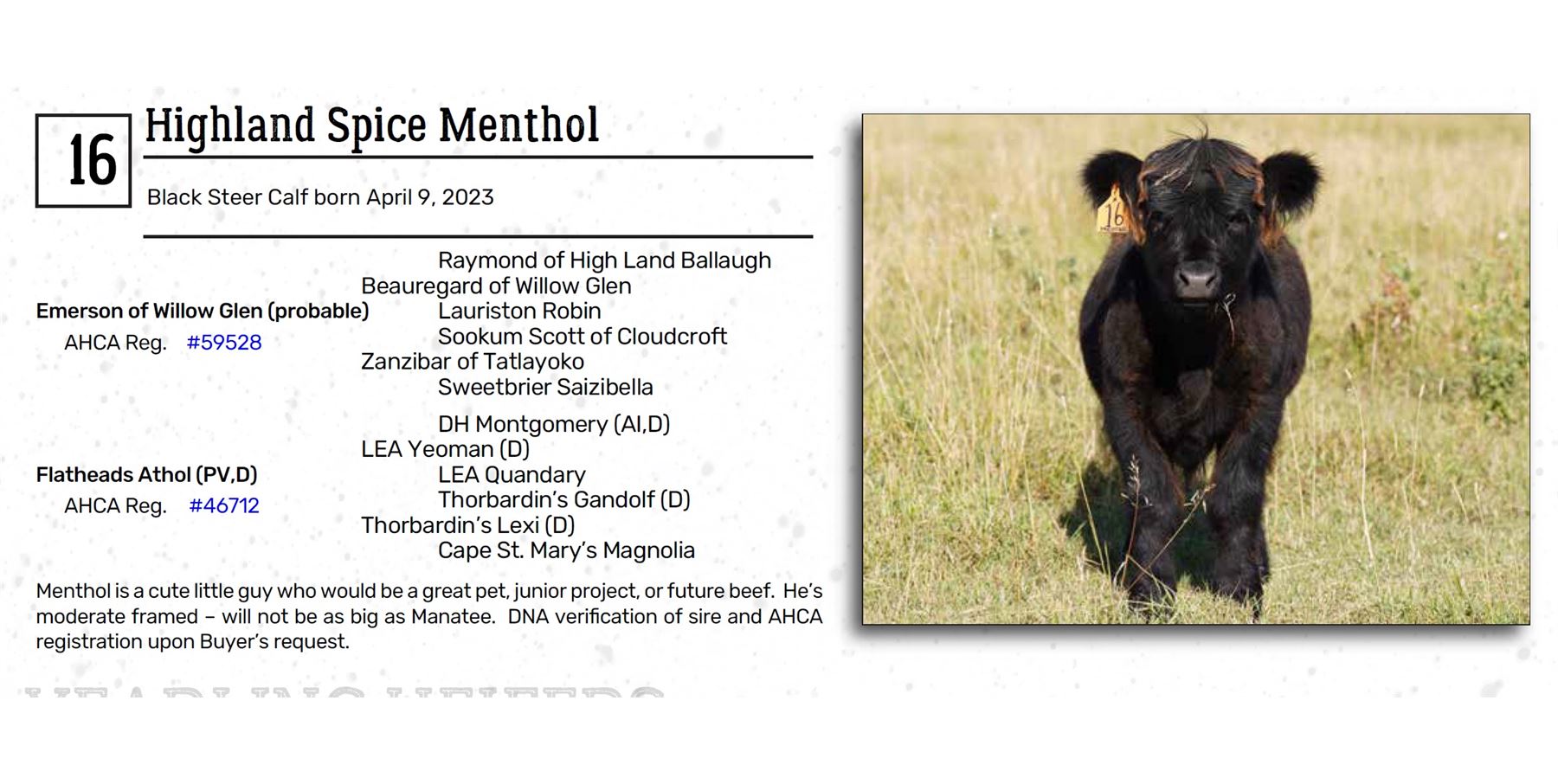 Menthol is a cute little guy who would be a great pet, junior project, or future beef. He’s