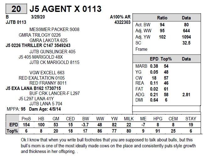 Ok I know that when you write bull footnotes that you are supposed to talk about bulls, but this bull’s mom is one of the most ideally made cows on the place and consistently puts style growth and thickness in her offspring. .