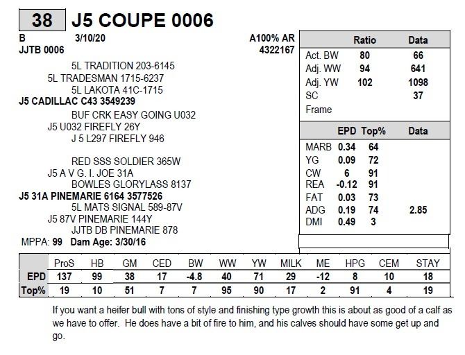If you want a heifer bull with tons of style and finishing type growth this is about as good of a calf as we have to offer. He does have a bit of fire to him, and his calves should have some get up and go.