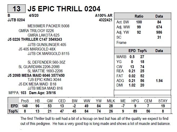 The first Thriller bull to sell had a bit of a hiccup on test but has all of the quality we expect to find out of this pedigree. He has a very good top is long made and shows a lot of muscle and balance.