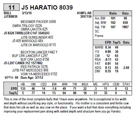 This is one of the most complete bulls that I have seen anywhere. He is exceptional in his width and depth without sacrificing any style, or functionality. His mother is a consistent and fertile cow that does her job as well as any cow on the place. If you want a bull that does everything including improving your replacement pen along with added depth and structure here you go Haratio.