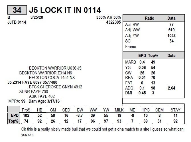 Ok this is a really nicely made bull that we could not get a dna match to a sire I guess so what can you do.