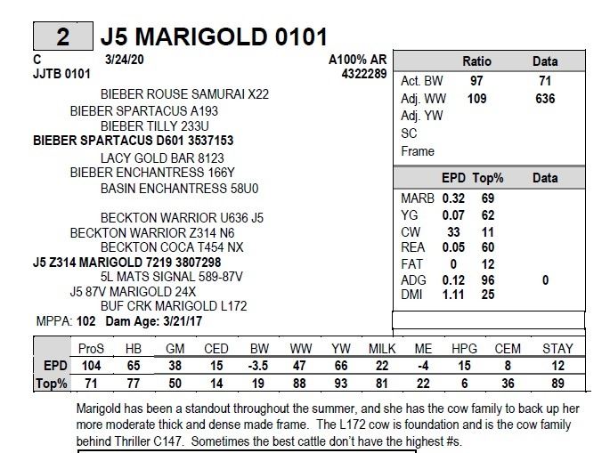 Marigold has been a standout throughout the summer, and she has the cow family to back up her more moderate thick and dense made frame. The L172 cow is foundation and is the cow family behind Thriller C147. Sometimes the best cattle don’t have the highest #s.