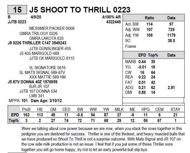 Were we talking about cow power because we are now, when you stack the cows together in this pedigree you are destined for success. Thriller is one of the thickest, and heavy muscled bulls that we have produced so Shoot To Thrill is not a surprise outcome. With Mats Signal and JR 107 on the cow side milk production is not an issue. I feel that if you put some of these Thriller sons together you will go home happy, try not to let an early powerful bull slip bye.