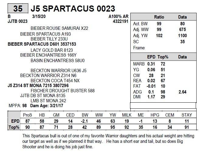 This Spartacus bull is out of one of my favorite Warrior daughters and his actual weight are hitting our target as well as if we planned it that way. He has a short ear and tail, but so does Big Shooter and he is doing his job just fine.