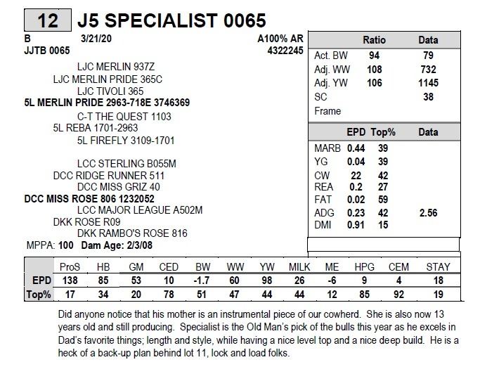 Did anyone notice that his mother is an instrumental piece of our cowherd. She is also now 13 years old and still producing. Specialist is the Old Man’s pick of the bulls this year as he excels in Dad’s favorite things; length and style, while having a nice level top and a nice deep build. He is a heck of a back-up plan behind lot 11, lock and load folks.