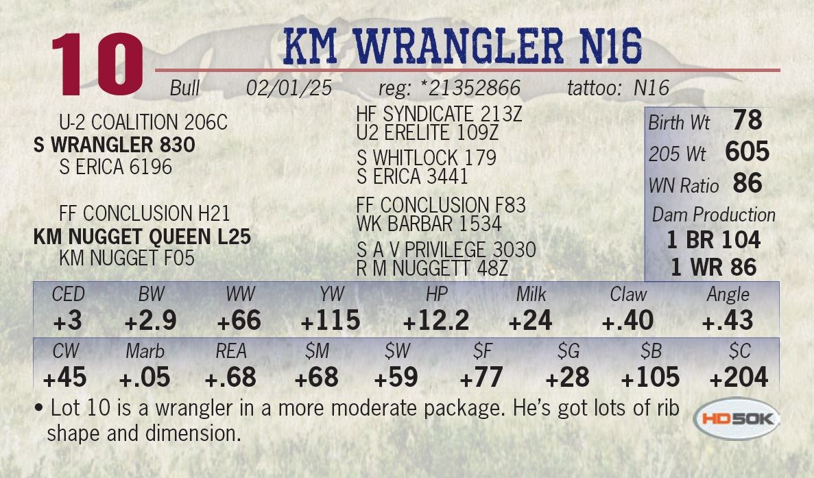 • Lot 10 is a wrangler in a more moderate package. He’s got lots of rib