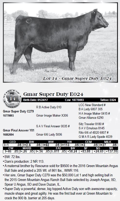 • A maternal brother by Resource sold for $9500 in the 2016 Green Mountain Angus