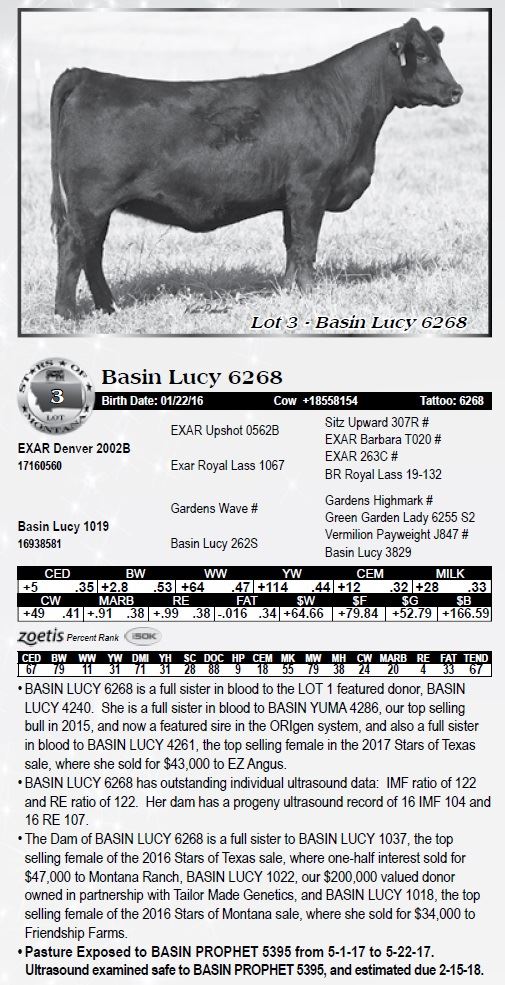 • BASIN LUCY 6268 is a full sister in blood to the LOT 1 featured donor, BASIN