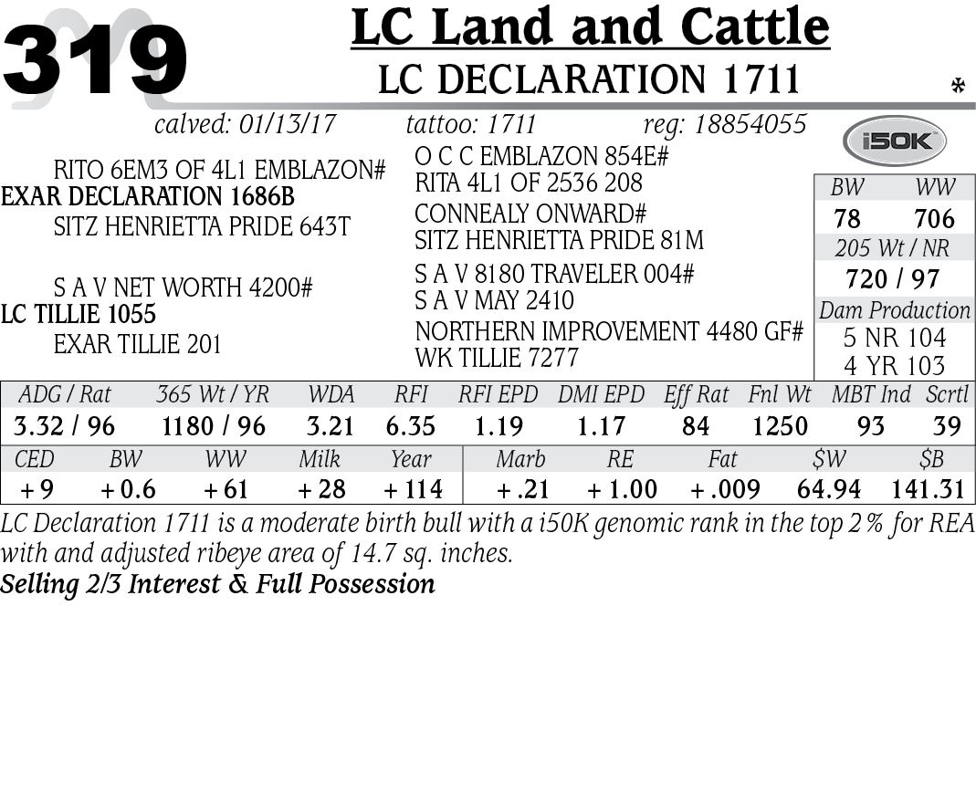 Each animal will be sold to the highest bidder with the auctioneer settling any dispute as to bids. All cattle will be sold according to the health regulations of the State of Montana. Interstate health certificates will be furnished. On all registered cattle in the sale, registration papers will be transferred to their new owner at the seller’s expense.