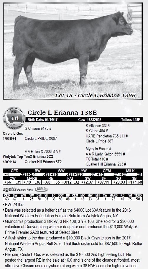 • Her sire, Circle L Gus was selected as the $10,500 2nd high selling bull. He