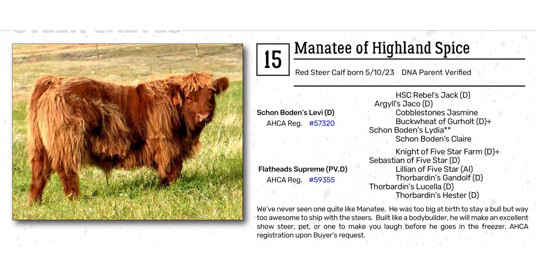 arrangements with the Sale Barn to keep cattle there until prompt pick-up, all cattle will be transported back to Highland Spice after the auction