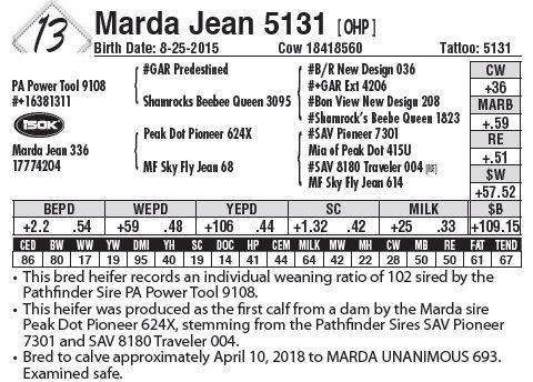 • This heifer was produced as the first calf from a dam by the Marda sire