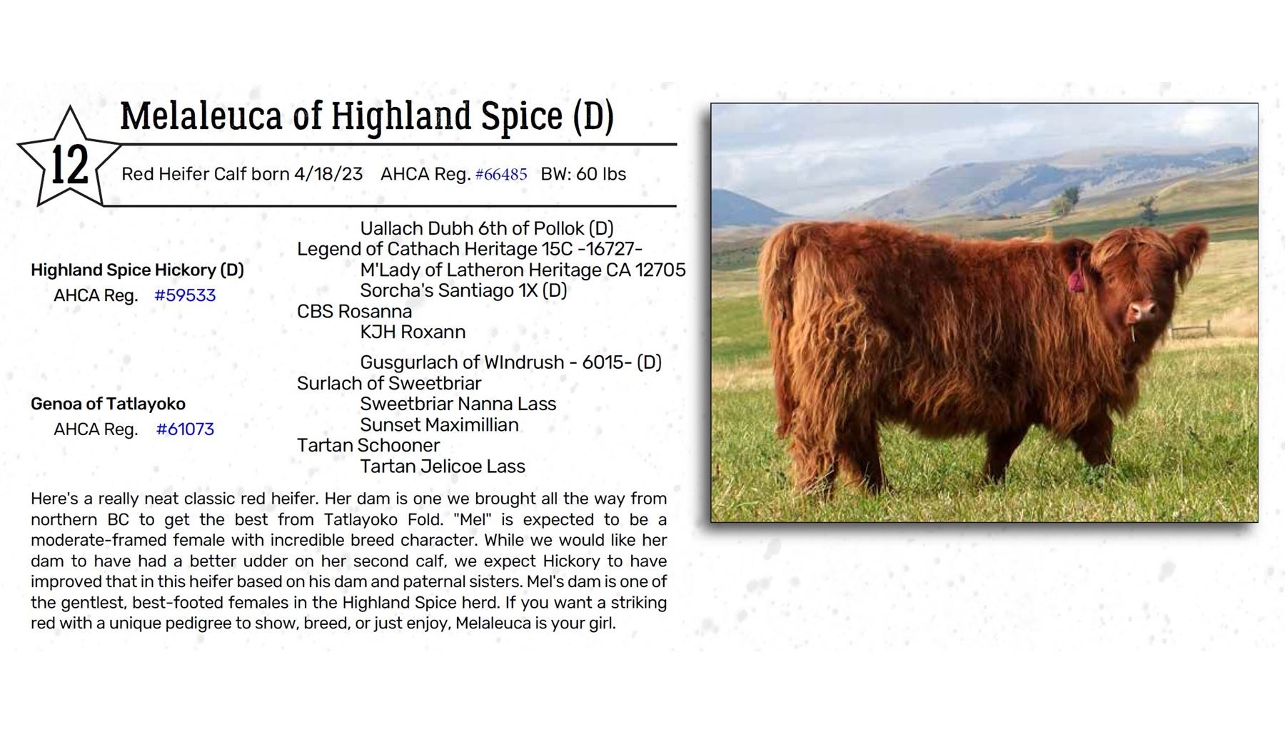 Retained Embryo Interest - Highland Spice retains a 50 percent embryo interest on Lots 1-12. These females may not be