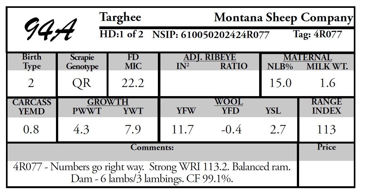 4R077 - Numbers go right way. Strong WRI 113.2. Balanced ram. Dam - 6 lambs/3 lambings. CF 99.1%.