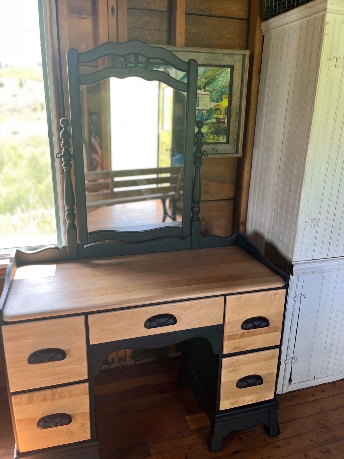 Refinished Solid Maple 5 Drawer Vanity, with attached removable wing mirror. Great as a desk or upcycled bath vanity for a bathroom vessel sink.18" deep X 42" wide by 30" tall. Total height is 65" with mirror attached.