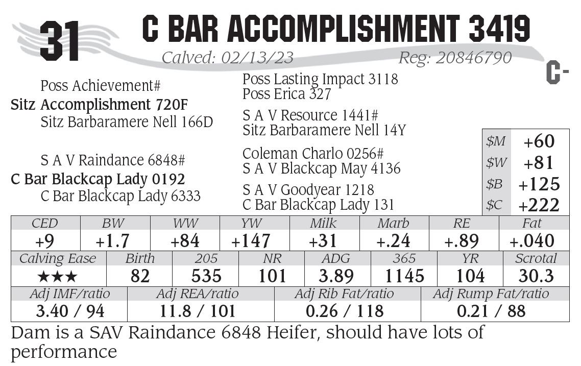 Dam is a SAV Raindance 6848 Heifer, should have lots of