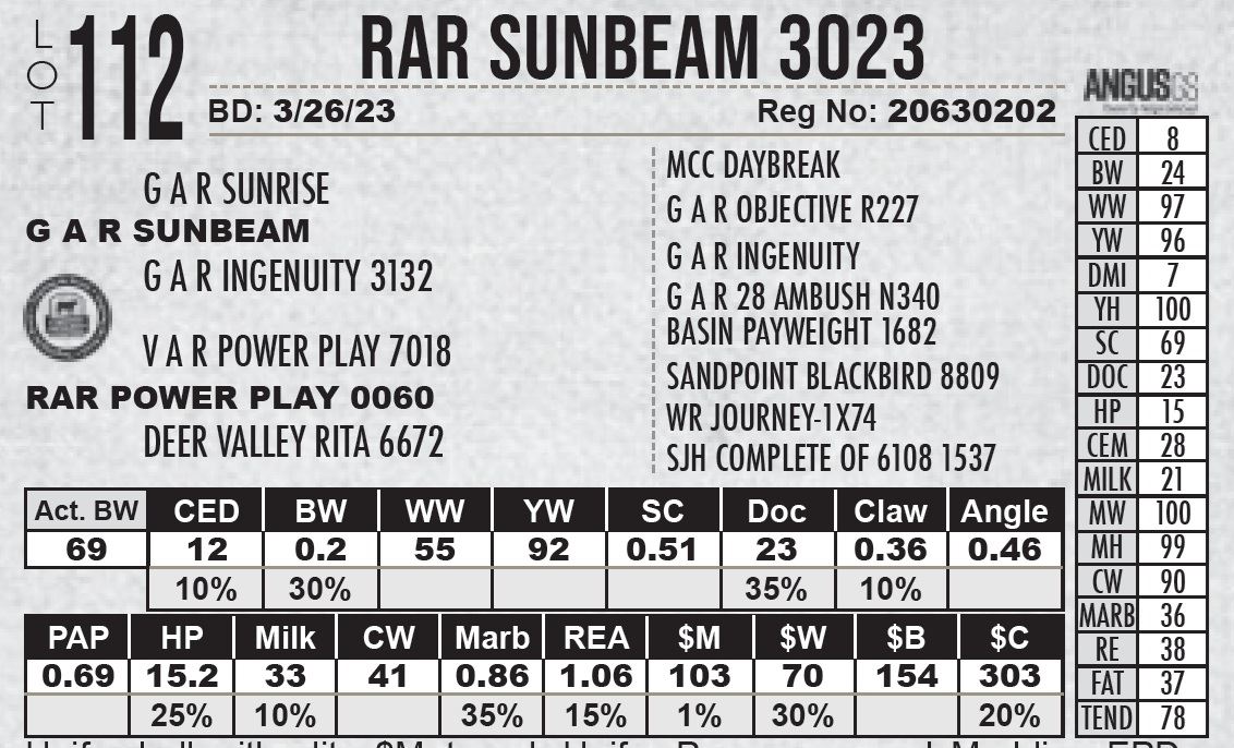 Heifer bull with moderate frame and exceptional Heifer Pregnancy and surpasses +$100 on $Maternal, TOP 1% $Maternal that is out of a Power Play daughter.