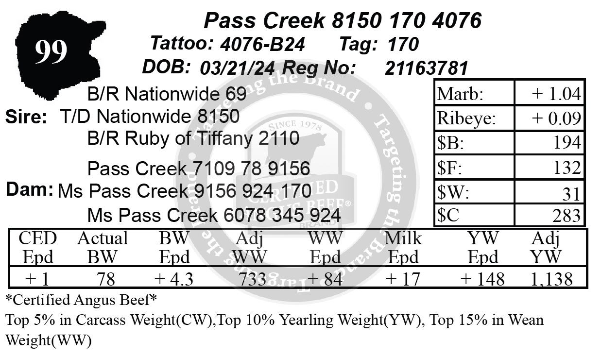 Top 5% in Carcass Weight(CW),Top 10% Yearling Weight(YW), Top 15% in Wean Weight(WW)