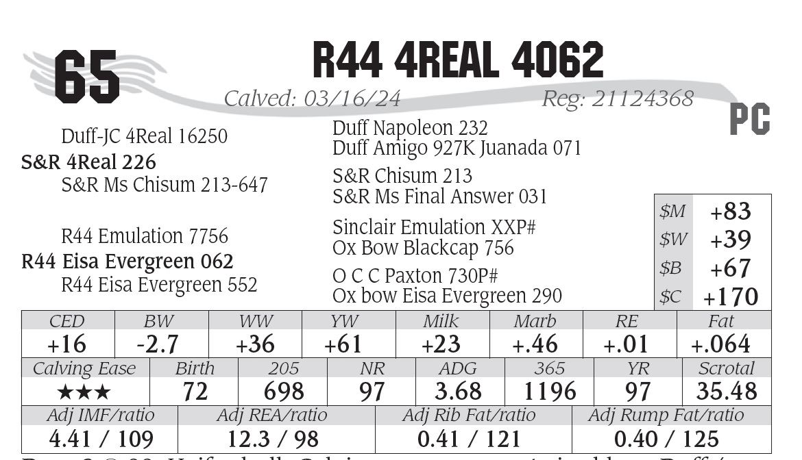 Dam 3 @ 99. Heifer bull. Calving ease prospect sired by a Duff 4