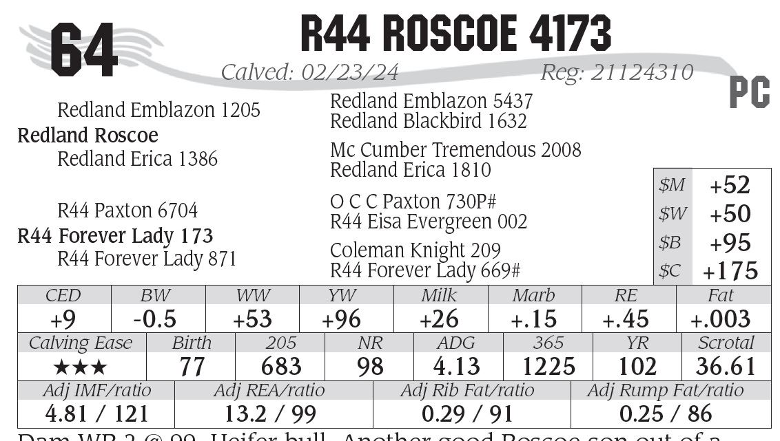 Dam WR 2 @ 99. Heifer bull. Another good Roscoe son out of a