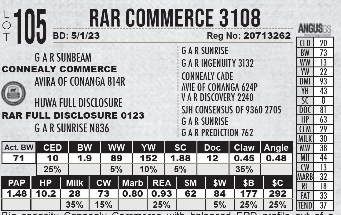 Big capacity Connealy Commerce with balanced EPD profile out of a daughter of long time Rooney Herd Sire Full Disclosure.