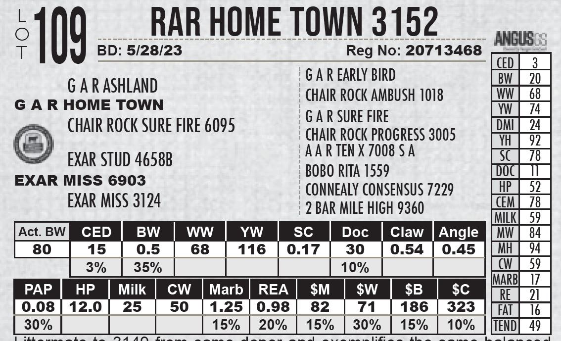 Littermate to 3149 from same donor and exemplifies the same balanced profile for calving ease, growth, maternal, and carcass merit.