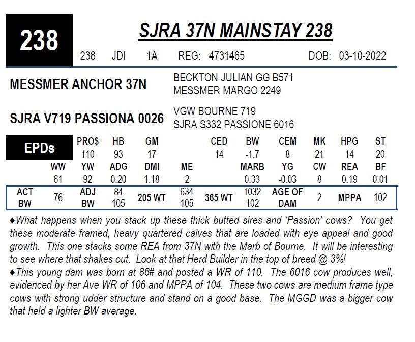 ♦What happens when you stack up these thick butted sires and ‘Passion’ cows? You get these moderate framed, heavy quartered calves that are loaded with eye appeal and good growth. This one stacks some REA from 37N with the Marb of Bourne. It will be interesting to see where that shakes out. Look at that Herd Builder in the top of breed @ 3%!