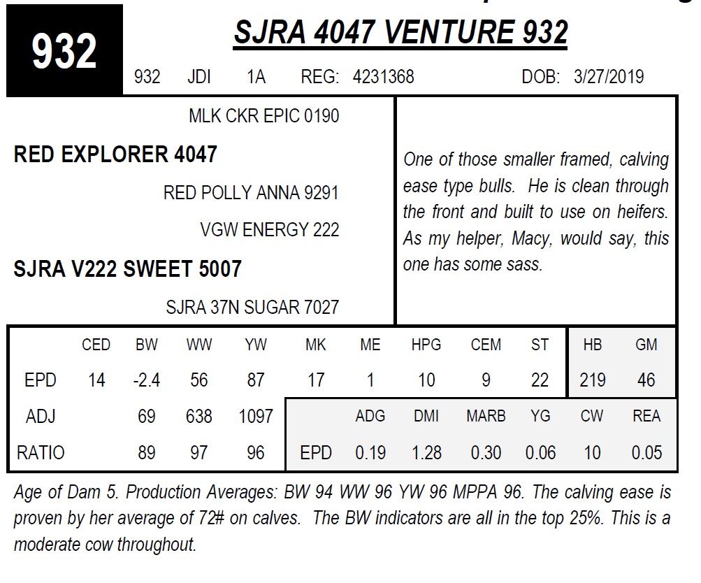 Age of Dam 5. Production Averages: BW 94 WW 96 YW 96 MPPA 96. The calving ease is