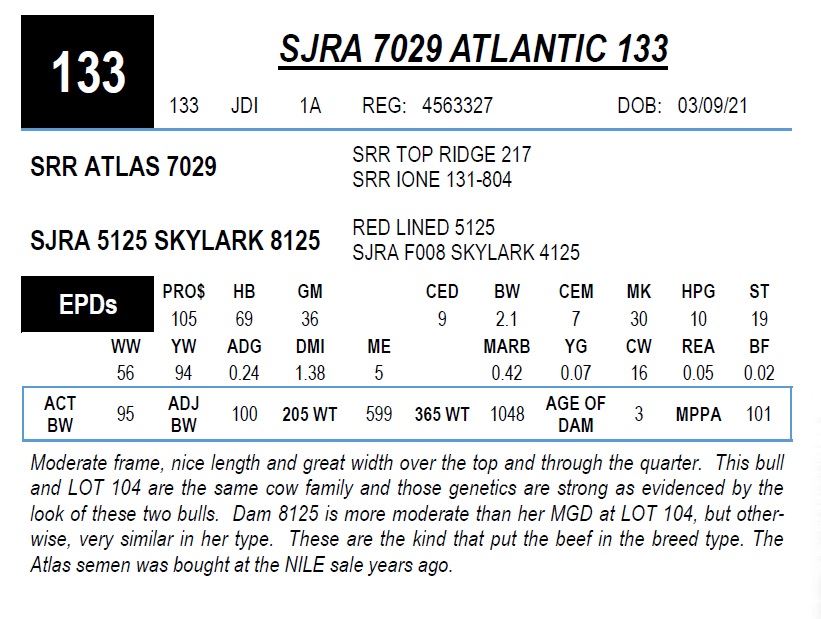 Moderate frame, nice length and great width over the top and through the quarter. This bull and LOT 104 are the same cow family and those genetics are strong as evidenced by the look of these two bulls. Dam 8125 is more moderate than her MGD at LOT 104, but other-wise, very similar in her type. These are the kind that put the beef in the breed type. The Atlas semen was bought at the NILE sale years ago.