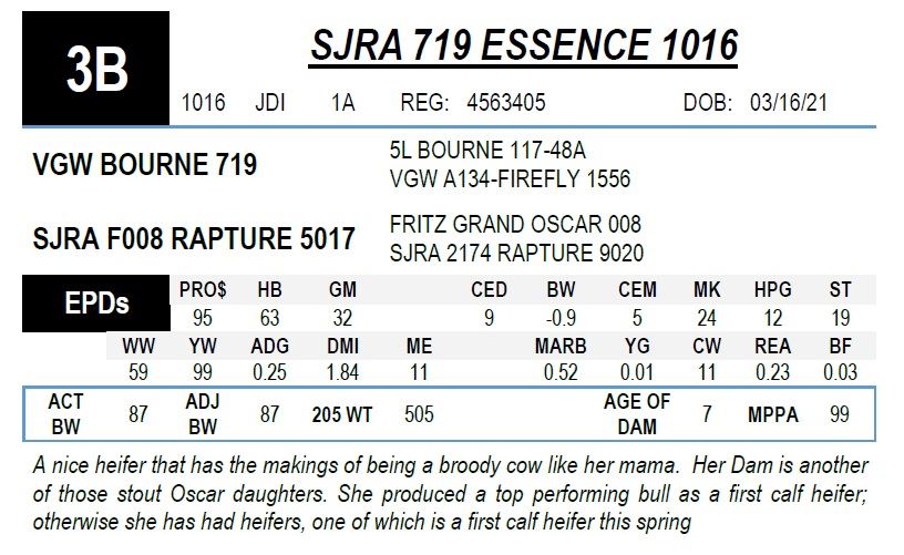 A nice heifer that has the makings of being a broody cow like her mama. Her Dam is another of those stout Oscar daughters. She produced a top performing bull as a first calf heifer; otherwise she has had heifers, one of which is a first calf heifer this spring