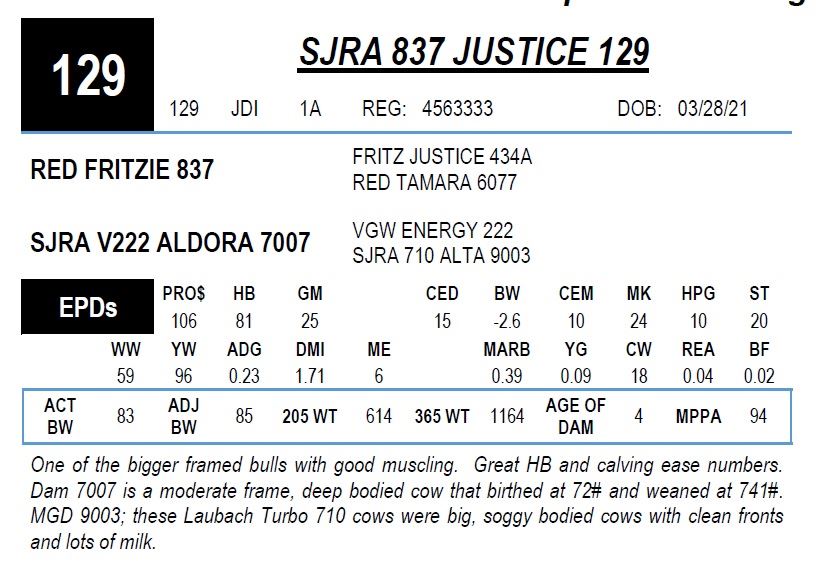 One of the bigger framed bulls with good muscling. Great HB and calving ease numbers. Dam 7007 is a moderate frame, deep bodied cow that birthed at 72# and weaned at 741#. MGD 9003; these Laubach Turbo 710 cows were big, soggy bodied cows with clean fronts and lots of milk.