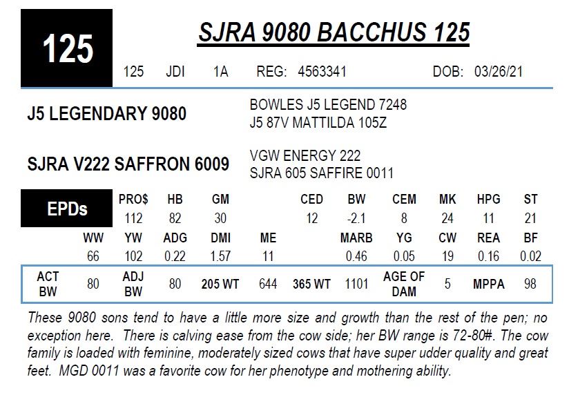 These 9080 sons tend to have a little more size and growth than the rest of the pen; no exception here. There is calving ease from the cow side; her BW range is 72-80#. The cow family is loaded with feminine, moderately sized cows that have super udder quality and great feet. MGD 0011 was a favorite cow for her phenotype and mothering ability.