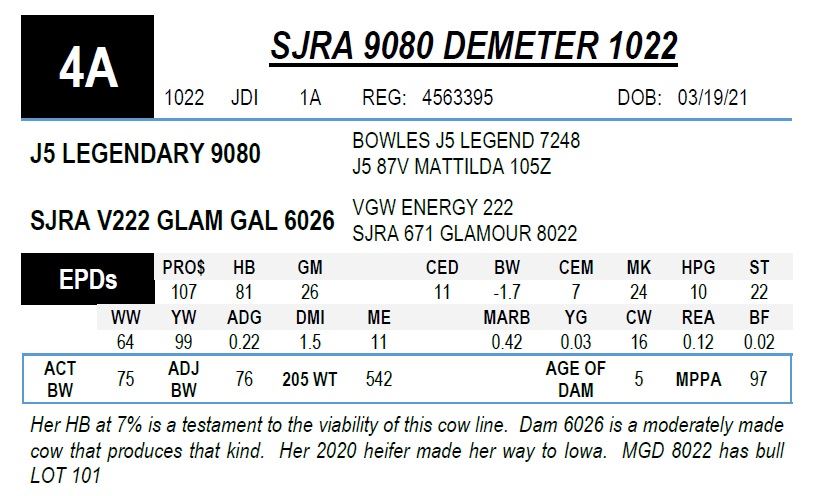 Her HB at 7% is a testament to the viability of this cow line. Dam 6026 is a moderately made cow that produces that kind. Her 2020 heifer made her way to Iowa. MGD 8022 has bull LOT 101