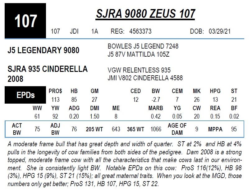 A moderate frame bull that has great depth and width of quarter. ST at 2% and HB at 4% pulls in the longevity of cow families from both sides of the pedigree. Dam 2008 is a strong topped, moderate frame cow with all the characteristics that make cows last in our environ-ment. She is consistently light BW. Notable EPDs on this cow: ProS 116(12%), HB 98 (3%), HPG 15 (9%), ST 21 (15%); all great maternal traits. When you look at the MGD, those numbers only get better; ProS 131, HB 107, HPG 15, ST 22.