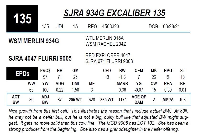 Nice growth from this first calf. This illustrates the reason that I include actual BW. At 80#, he may not be a heifer bull, but he is not a big, bulky bull like that adjusted BW might sug-gest. It gets no more solid than this cow line. The MGD 9008 has LOT 102. She has been a strong producer from the beginning. She also has a granddaughter in the heifer offering.