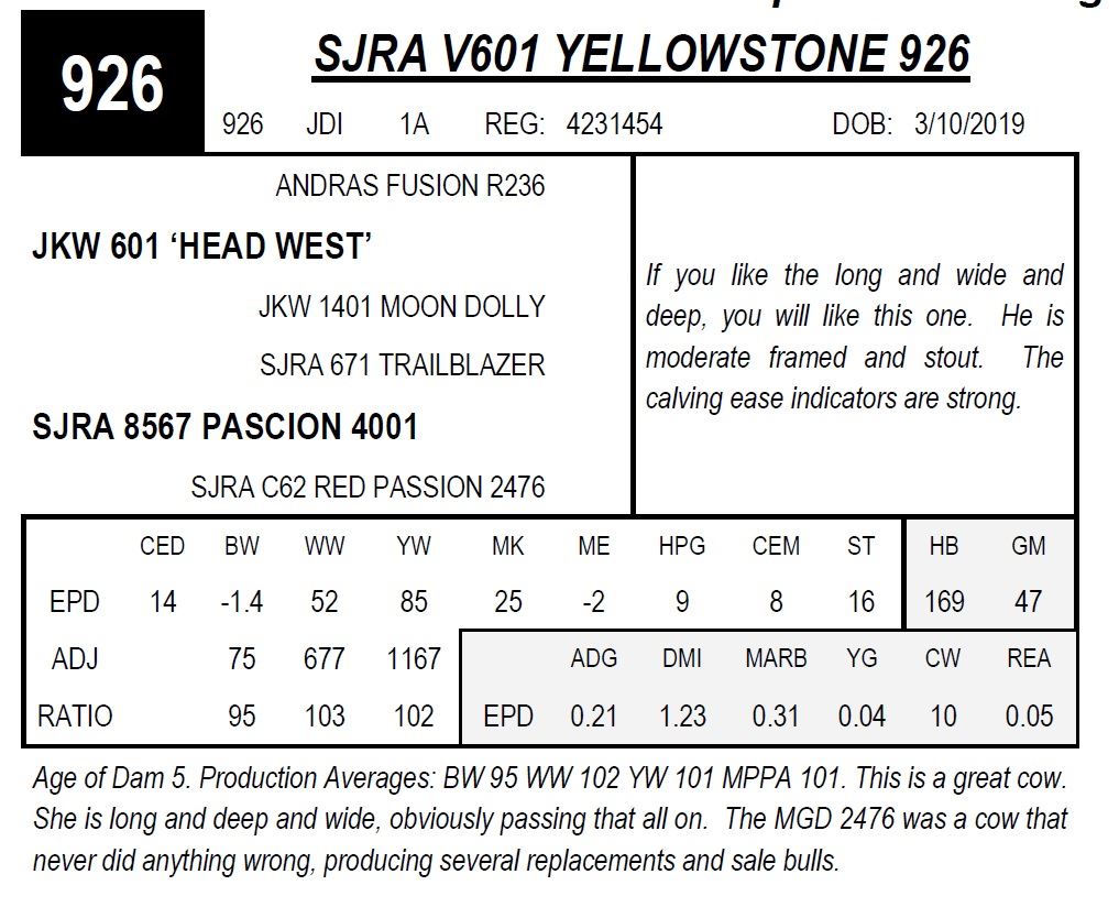 Age of Dam 5. Production Averages: BW 95 WW 102 YW 101 MPPA 101. This is a great cow.