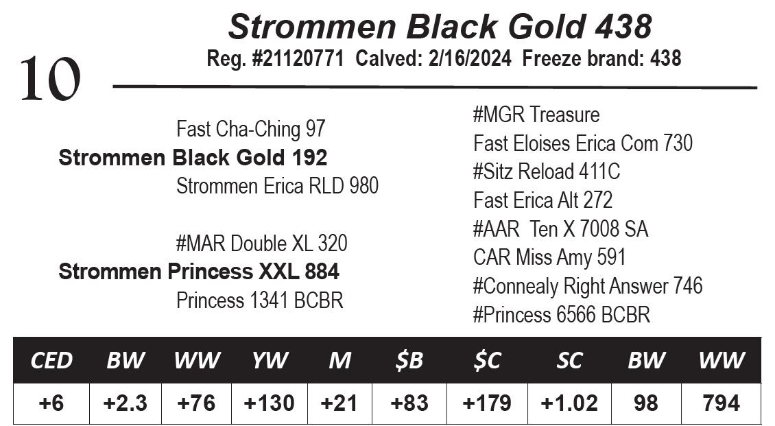 438 is a good quality power bull that has the capability to produce pounds for you at weaning time. *His dam is a really good cow that has been consistent in production and has a really nice foot, udder and leg structure! Dam's WR: 5 @ 104