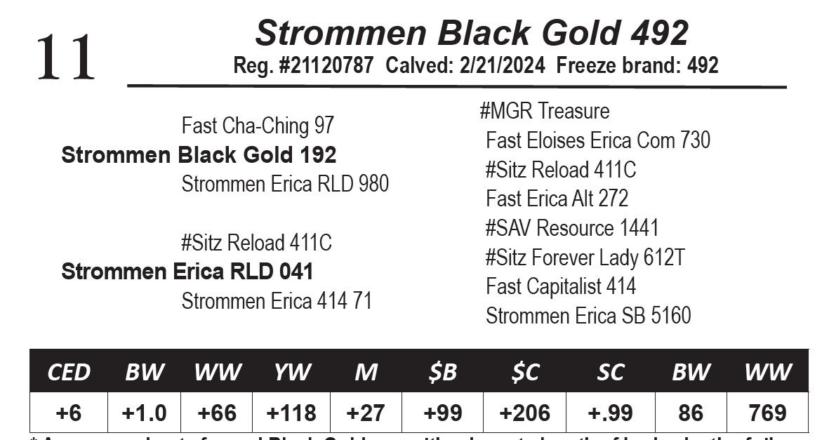 A more moderate framed Black Gold son with adequate length of body, depth of rib and hip shape and size. *Dam is one of our better young cows coming from the great Erica cow family.*Dam's WR: 3 @ 103.
