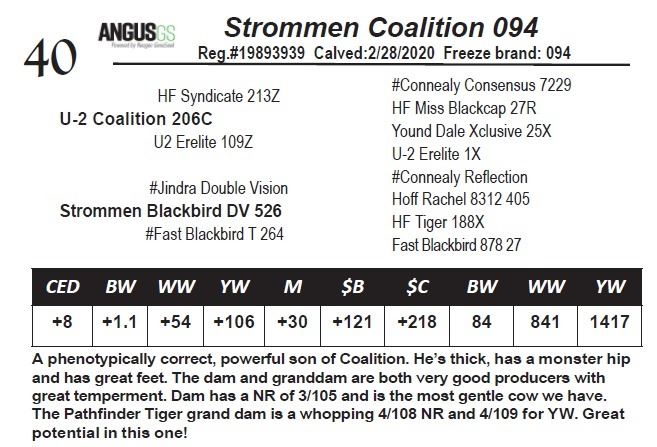 A phenotypically correct, powerful son of Coalition. He’s thick, has a monster hip and has great feet. The dam and granddam are both very good producers with great temperment. Dam has a NR of 3/105 and is the most gentle cow we have. The Pathfi nder Tiger grand dam is a whopping 4/108 NR and 4/109 for YW. Great potential in this one!