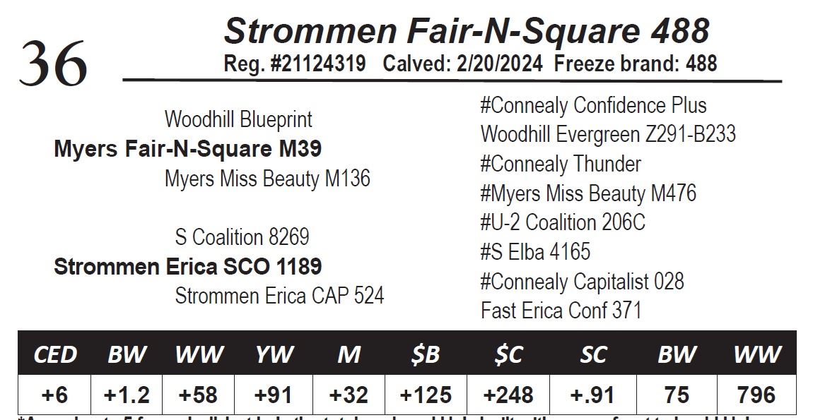 A moderate 5 frame bull, but he's the total package! He's built with power front to back! He's been a favorite since the day he was born! 488's Dam is a favorite. She's a 1000 lbs soaking wet and has weaned off over 70% of her body to date! His dam stems from the great Erica 734 cow.Dam's WR: 2 @ 97 in a 358 day interval.