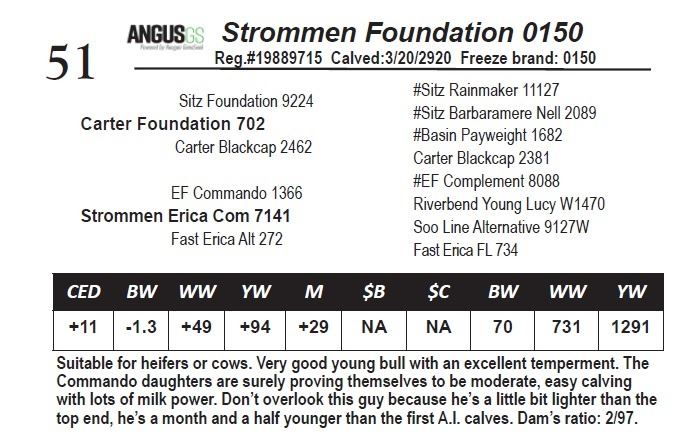 Suitable for heifers or cows. Very good young bull with an excellent temperment. The Commando daughters are surely proving themselves to be moderate, easy calving with lots of milk power. Don’t overlook this guy because he’s a little bit lighter than the top end, he’s a month and a half younger than the fi rst A.I. calves. Dam’s ratio: 2/97.