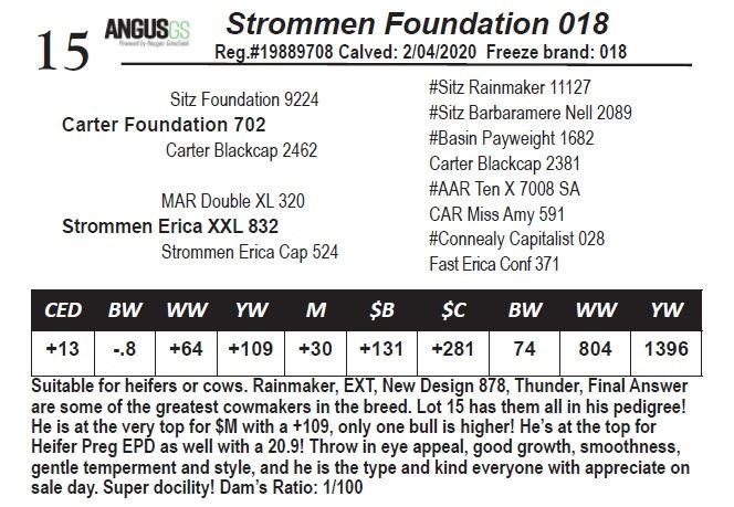 Suitable for heifers or cows. Rainmaker, EXT, New Design 878, Thunder, Final Answer are some of the greatest cowmakers in the breed. Lot 15 has them all in his pedigree! He is at the very top for $M with a +109, only one bull is higher! He’s at the top for Heifer Preg EPD as well with a 20.9! Throw in eye appeal, good growth, smoothness, gentle temperment and style, and he is the type and kind everyone with appreciate on sale day. Super docility! Dam’s Ratio: 1/100