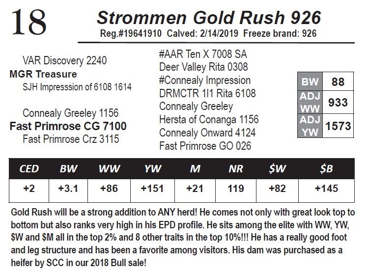 Gold Rush will be a strong addition to ANY herd! He comes not only with great look top to bottom but also ranks very high in his EPD profile. He sits among the elite with WW, YW, $W and $M all in the top 2% and 8 other traits in the top 10%!!! He has a really good foot and leg structure and has been a favorite among visitors. His dam was purchased as a heifer by SCC in our 2018 Bull sale!