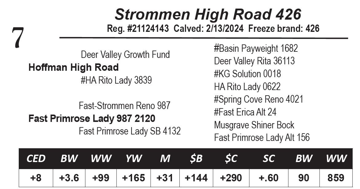 Another heavyweight High Road son that fits with Lots 1 and 6.*The Reno 987 daughters have had a natural docility and production ability.*Very good EPD profile with a WW, $M and $Win the top 1%. Dam's WR: 1 @114.