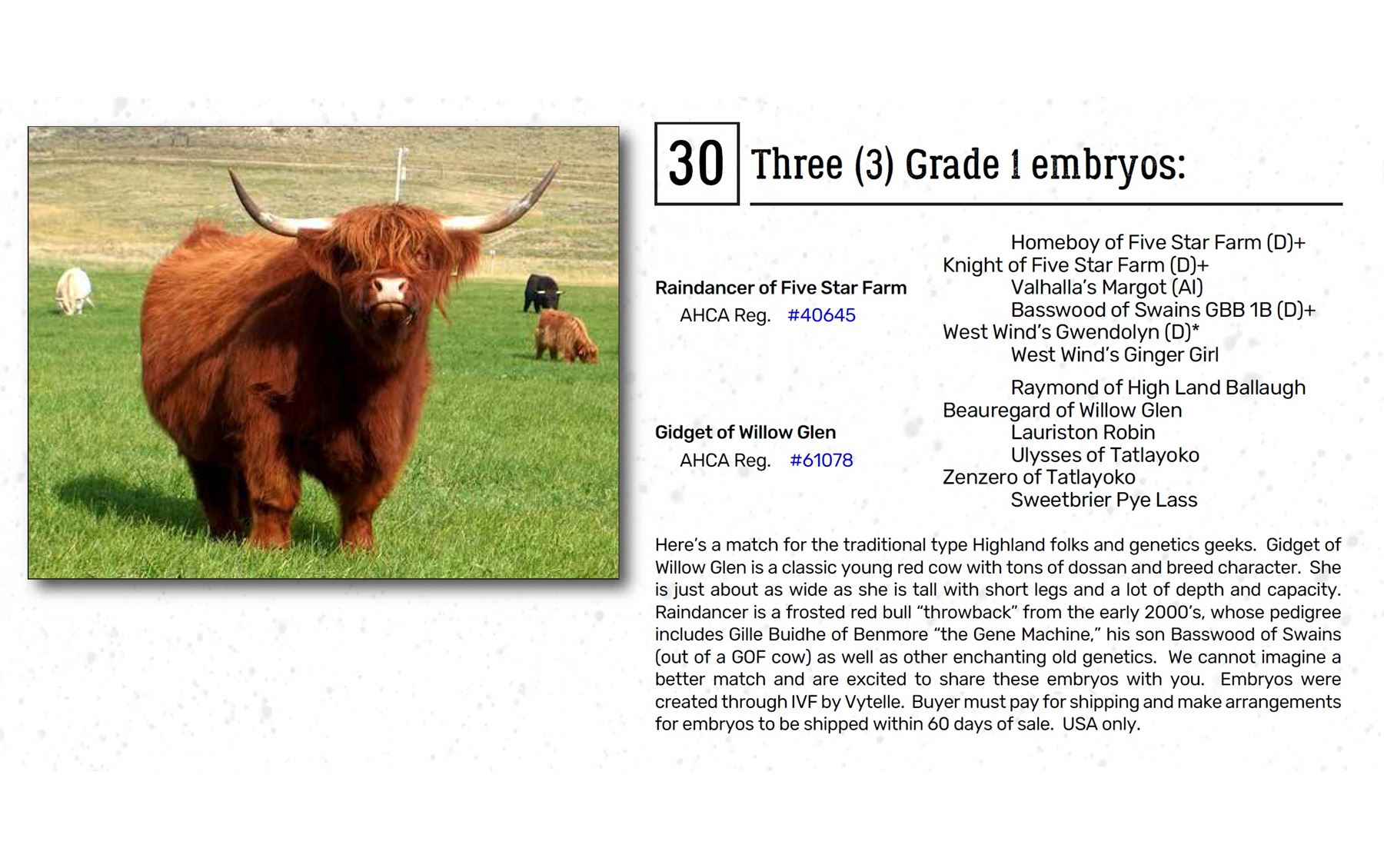 Retained Embryo Interest - Highland Spice retains a 50 percent embryo interest on Lots 1-12. These females may not be