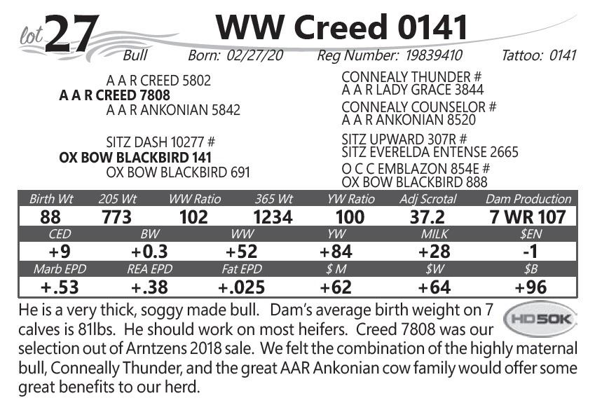 He is a very thick, soggy made bull. Dam’s average birth weight on 7